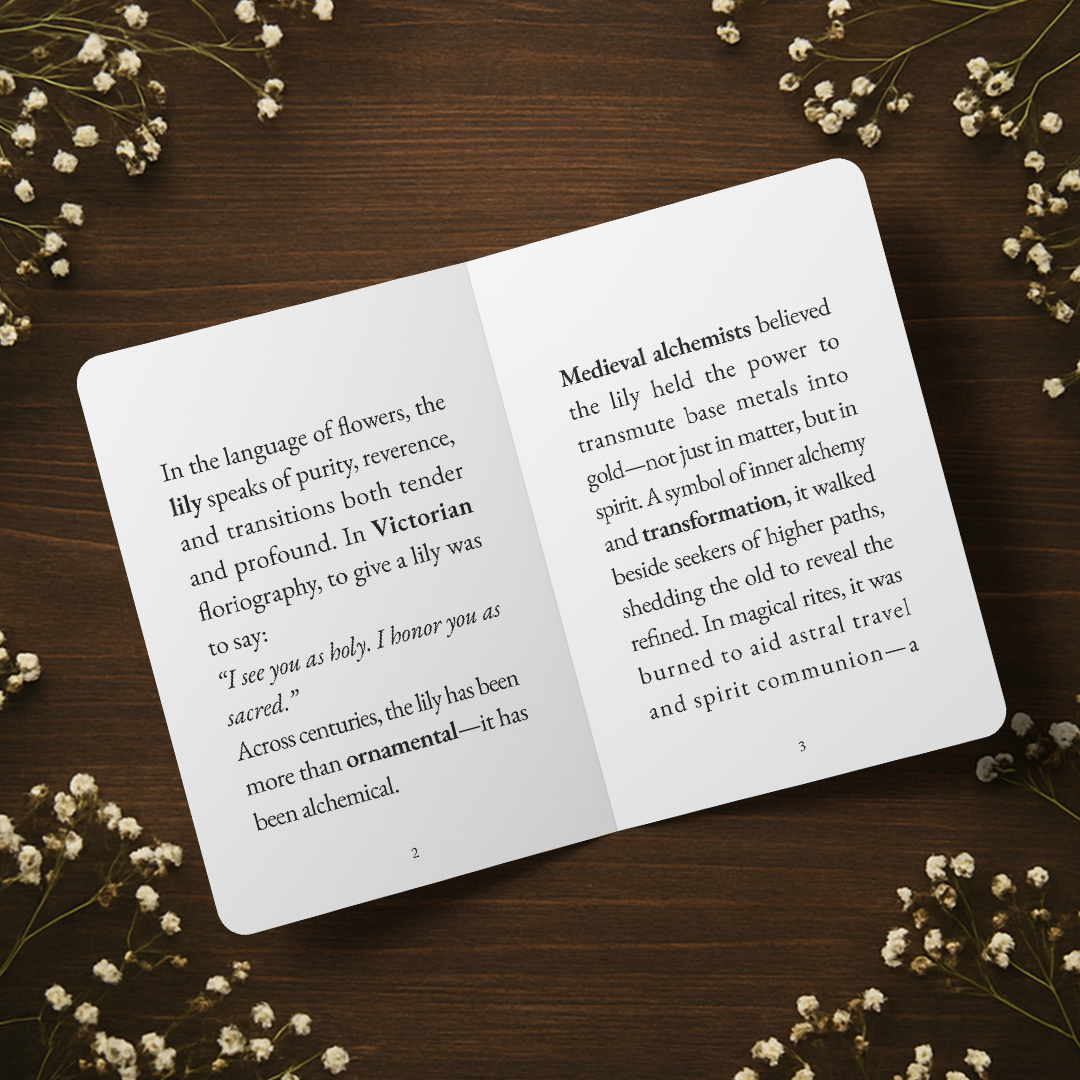 Across centuries, the lily has been more than ornamental—it has been alchemical. Medieval alchemists believed the lily held the power to transmute base metals into gold—not just in matter, but in spirit. A symbol of inner alchemy and transformation, it walked beside seekers of higher paths, shedding the old to reveal the refined. In magical rites, it was burned to aid astral travel and spirit communion—a blossom of both earth and ether. In old Europe, dried lilies were worn close to the heart to attract love. The common thread: the lily stirs transformation, in all its forms.