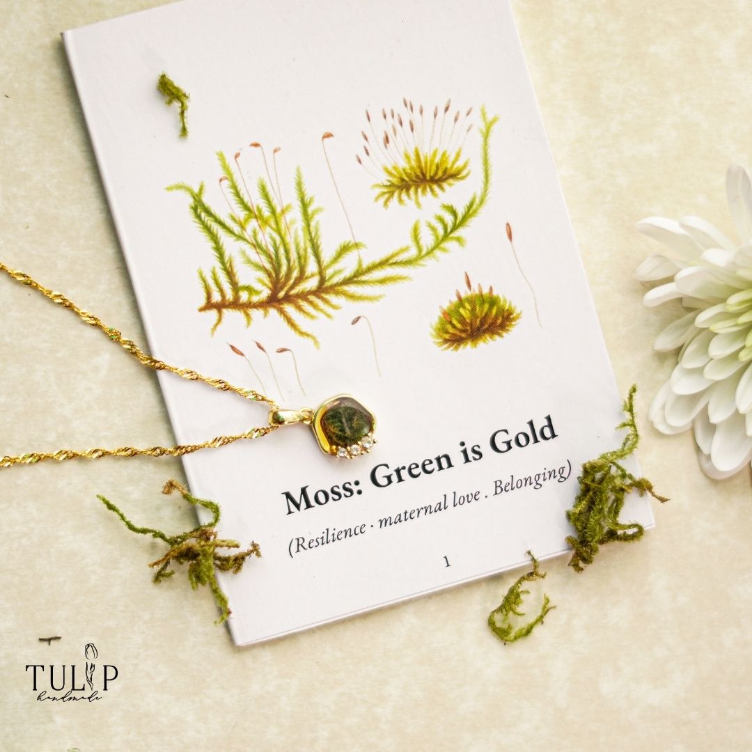 In the quiet lore of floriography, moss speaks of maternal love — that rare kind that asks for nothing, gives everything, and remains unseen. It is the green hush beneath tall trees, a balm for the weary, a guardian of slow beginnings. When Chernobyl’s soil was scorched by nuclear fire — when radiation silenced the birds and blackened the trees — moss crept in. It did not turn away. Instead, it began to grow, binding radioactive elements like cesium and strontium within its body. Where concrete barriers cracked and machines failed, moss persisted. Scientists now call it a “bio-shield” — a quiet first responder, laying a green veil over the earth’s poisoned wounds. Not with might, but with mercy. Moss is a humble plant. It hugs the ground with leaves a single cell thick, yet it has the power to dissolve stone. It has survived ice ages and millennia without water. It shows the power of slow and gentle persistence. Across various cultures, moss is seen as a symbol of resilience, persistence, and rebirth. Its ability to thrive in damp, shaded environments where other plants cannot underscores its quiet endurance — and the strength found in adaptability. Wear it as a reminder: even in devastation, you carry the power to begin again — to soften what’s broken, to cover what hurts, and to grow still, even in the darkest places.